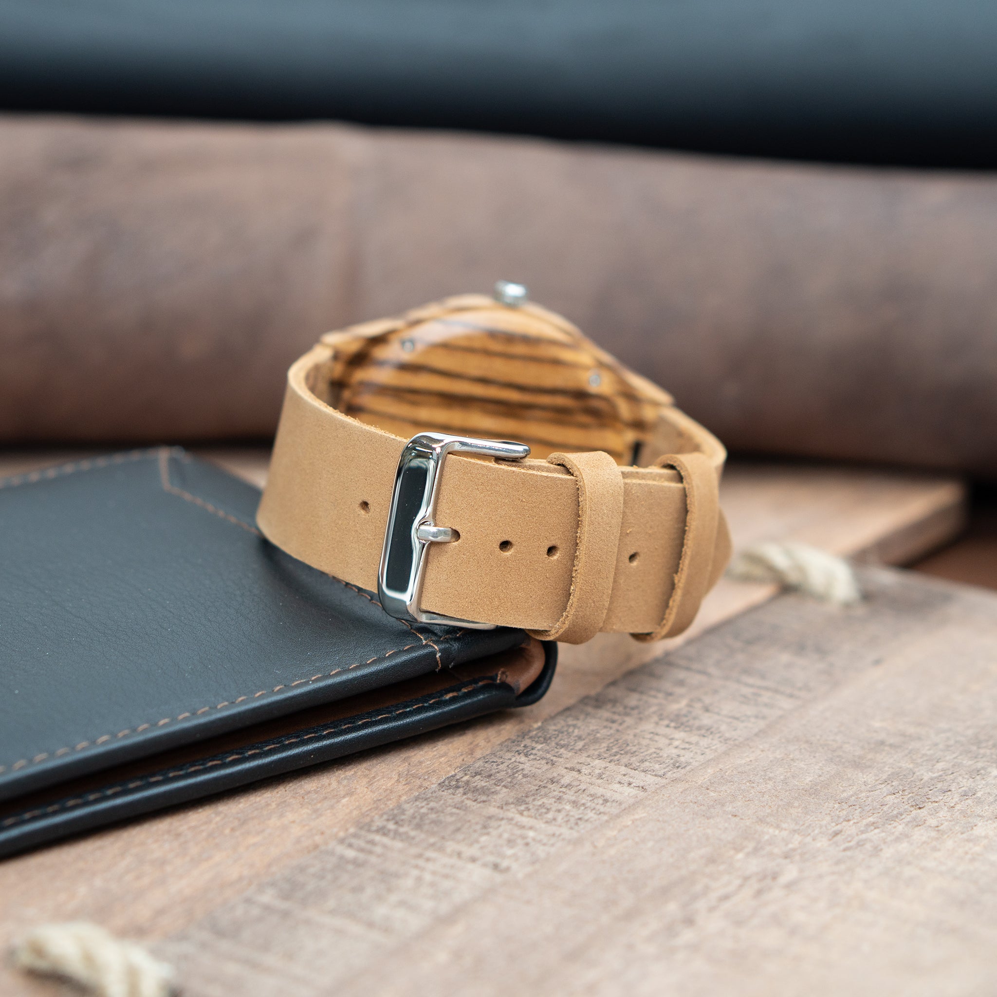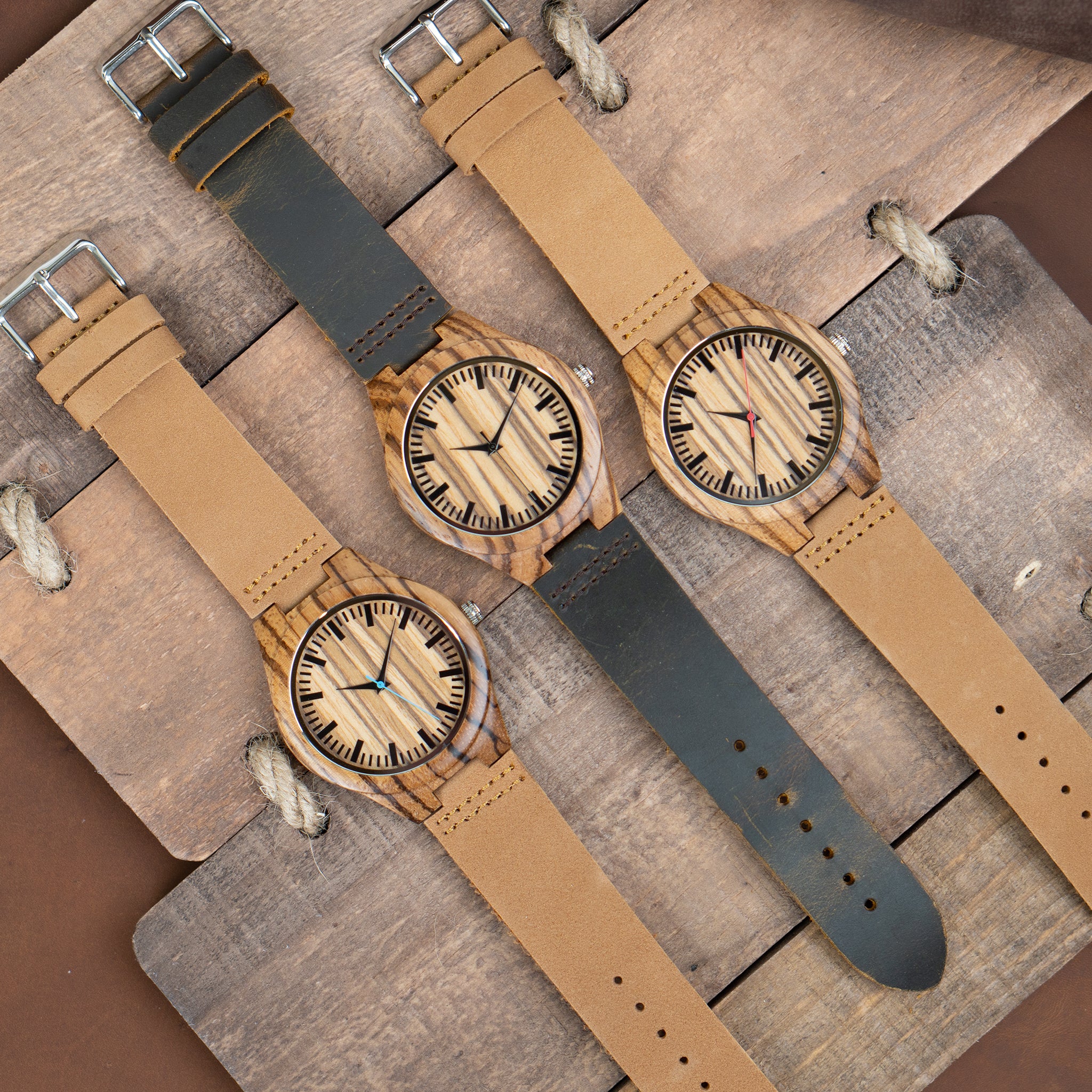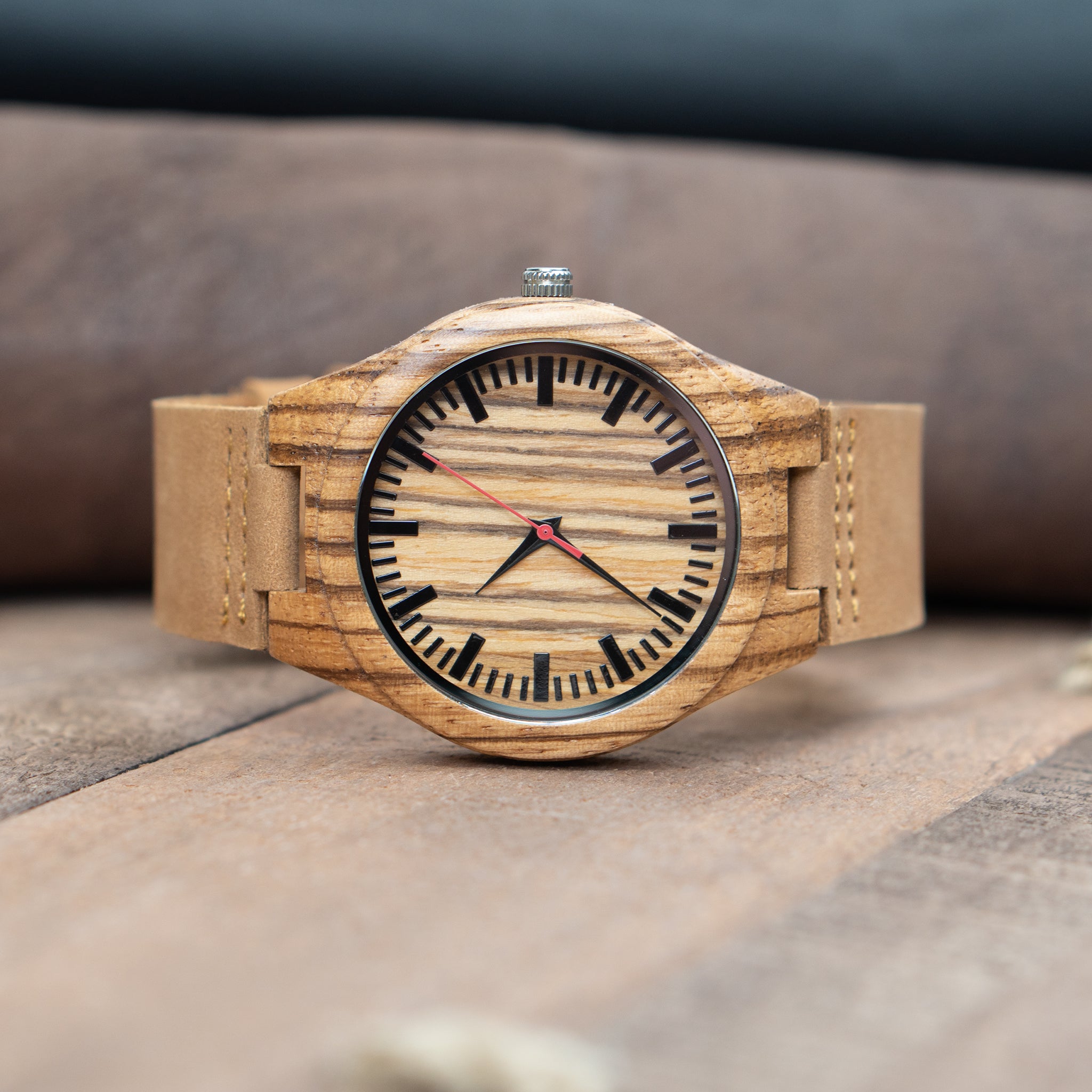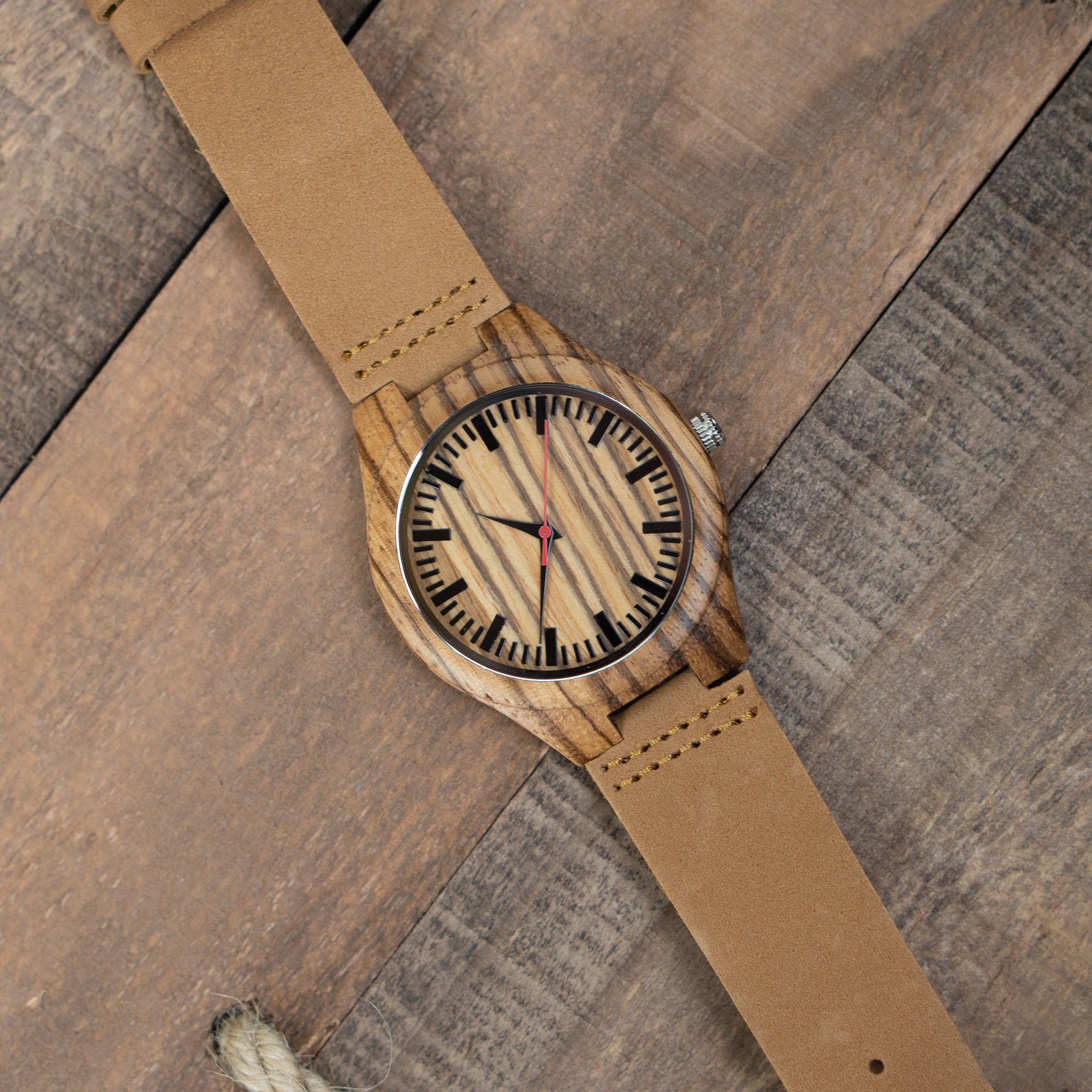 Forest II is the cousin to the Forest wooden watch made from natural zebra wood and has a genuine leather band that is soft and comfortable. Features unique red second hand for unique, subtle accent.