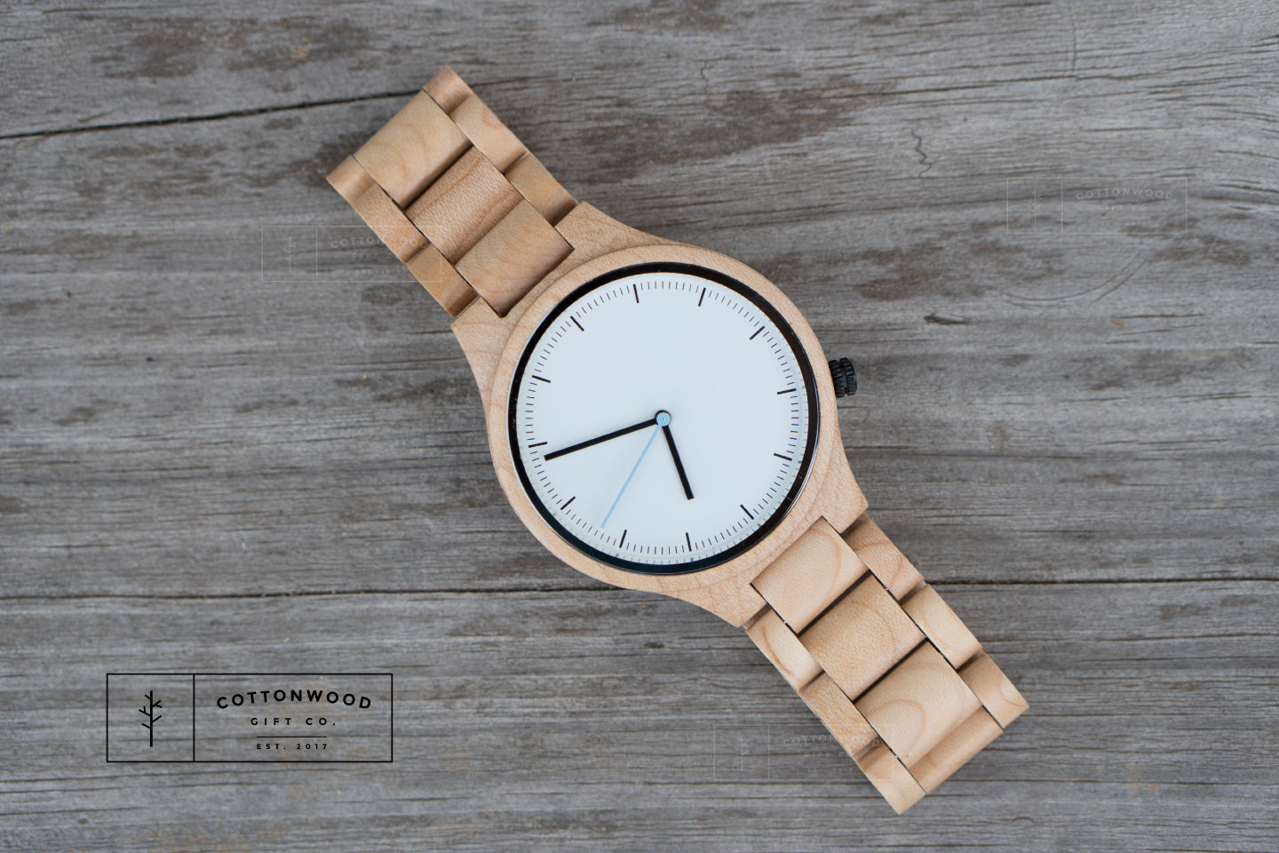 This maple wooden watch made from natural maple wood and has an all wood link watch band that can be adjusted by removing wood links. Features a white face, black markings and accented with a blue second-hand.