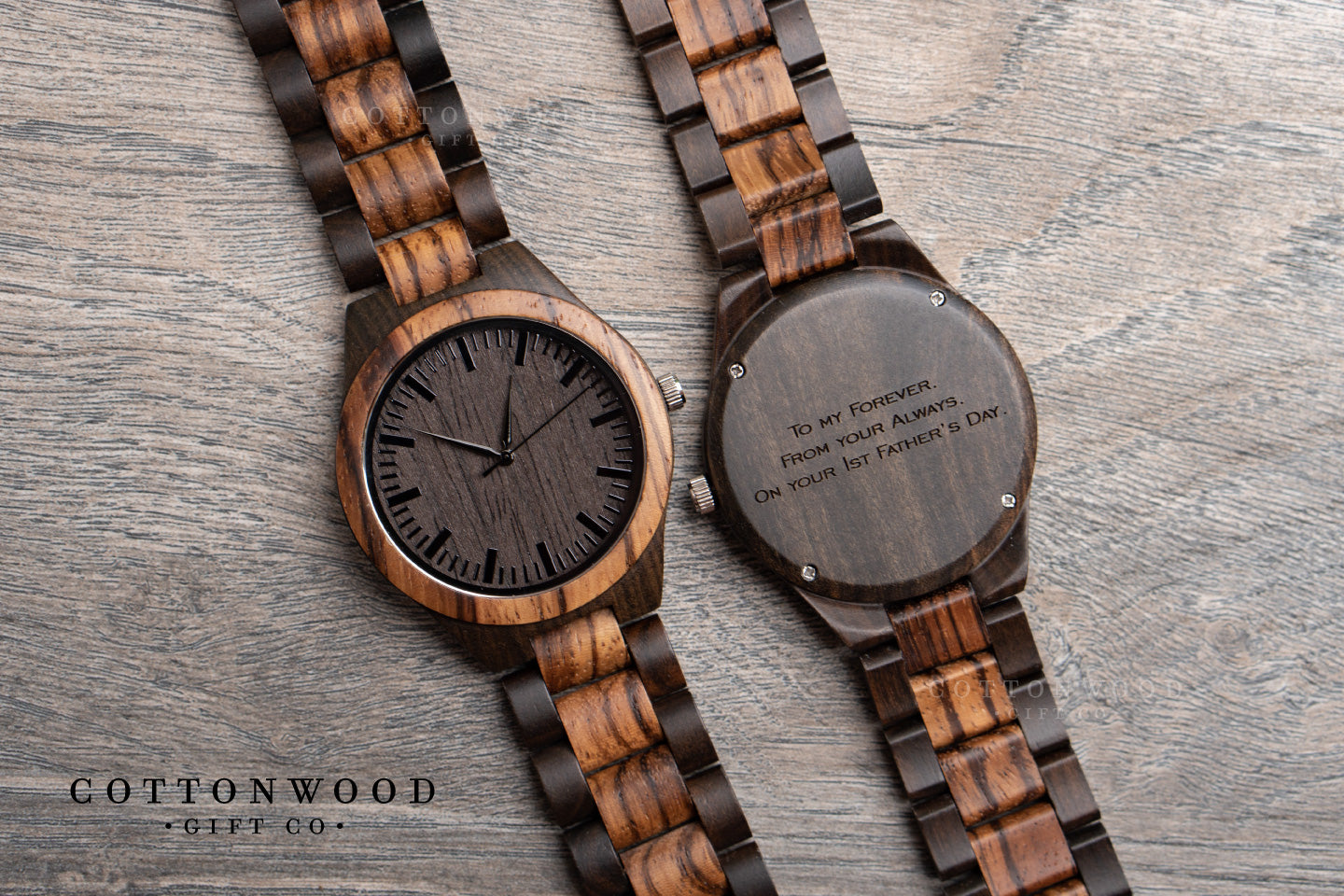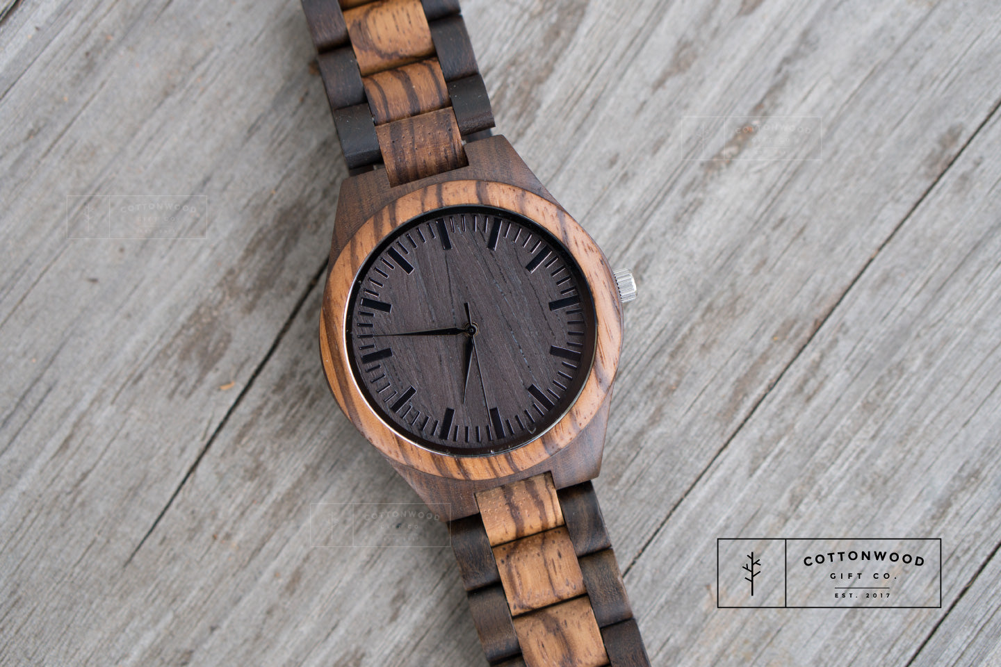 Clayton is a wood watch made from natural zebra and sandalwood and has an all wood band that can be adjusted by removing wooden links. Black hands and minute markers.