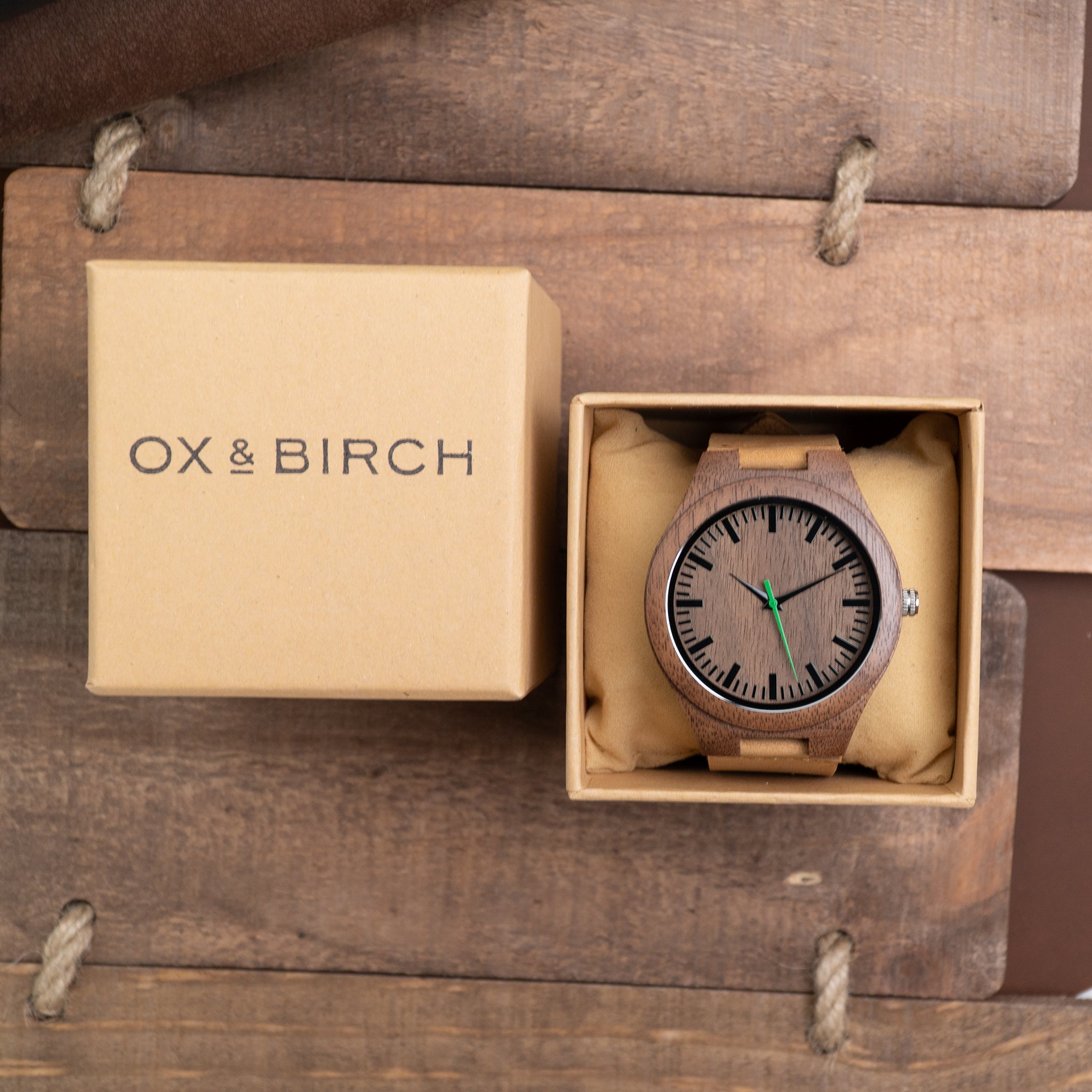 Denver is a wooden watch made from natural walnut wood and has a light brown genuine leather band that is soft and comfortable. Accented with a unique green second hand.