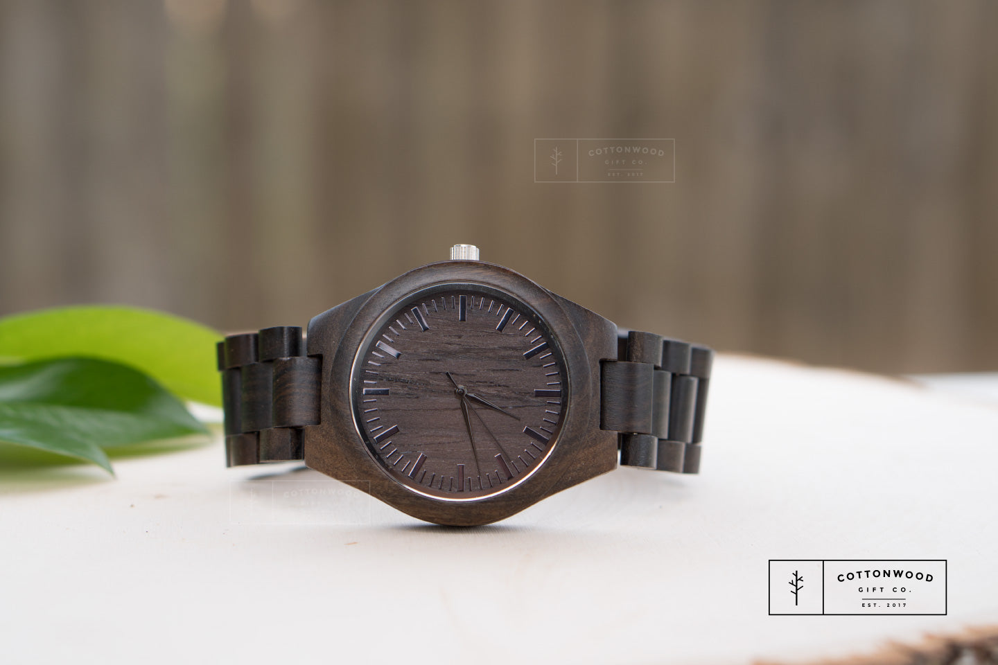 Wooden watch for men made from natural exotic sandalwood and has an all wood band that can be adjusted by removing wooden links. Black hand movements and minute and hour markers.