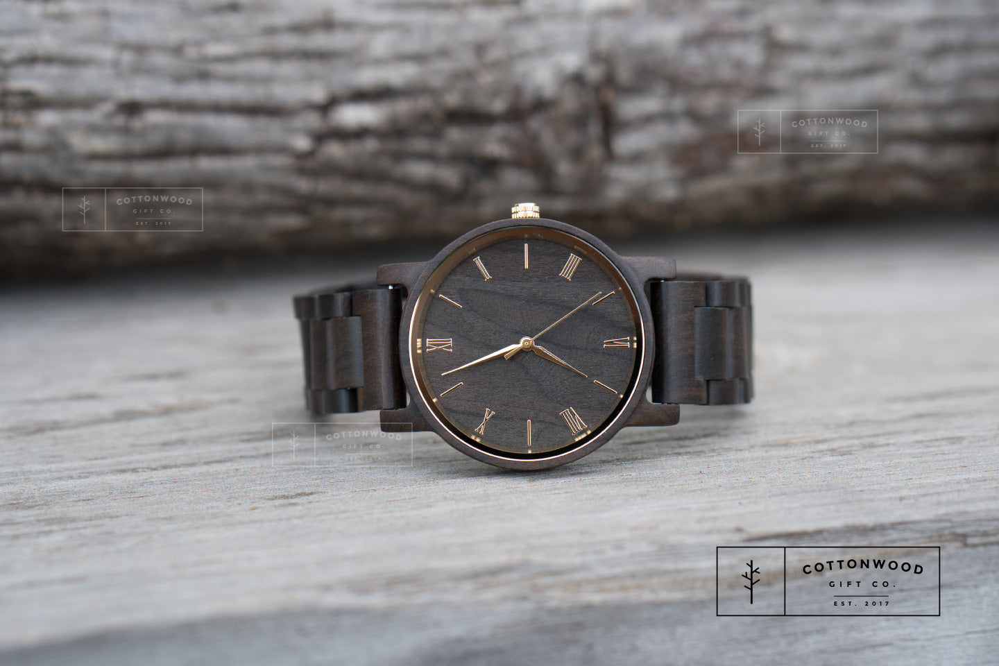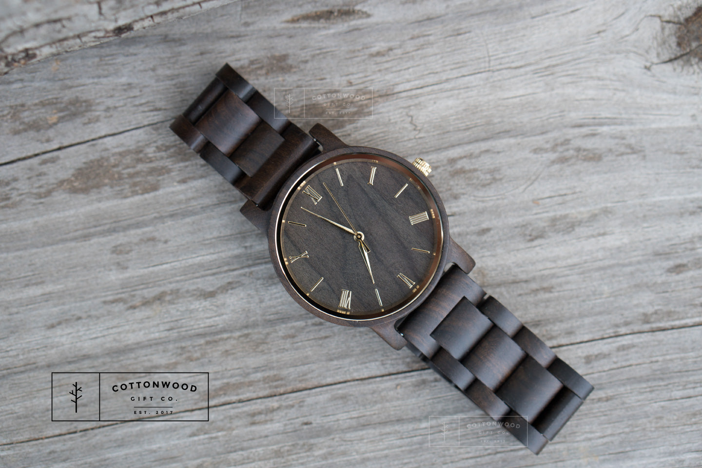 Wood watch made from natural wood and has an all wood band that can be adjusted by removing wooden links. Gold hands and hour markers, stainless steel clasp.