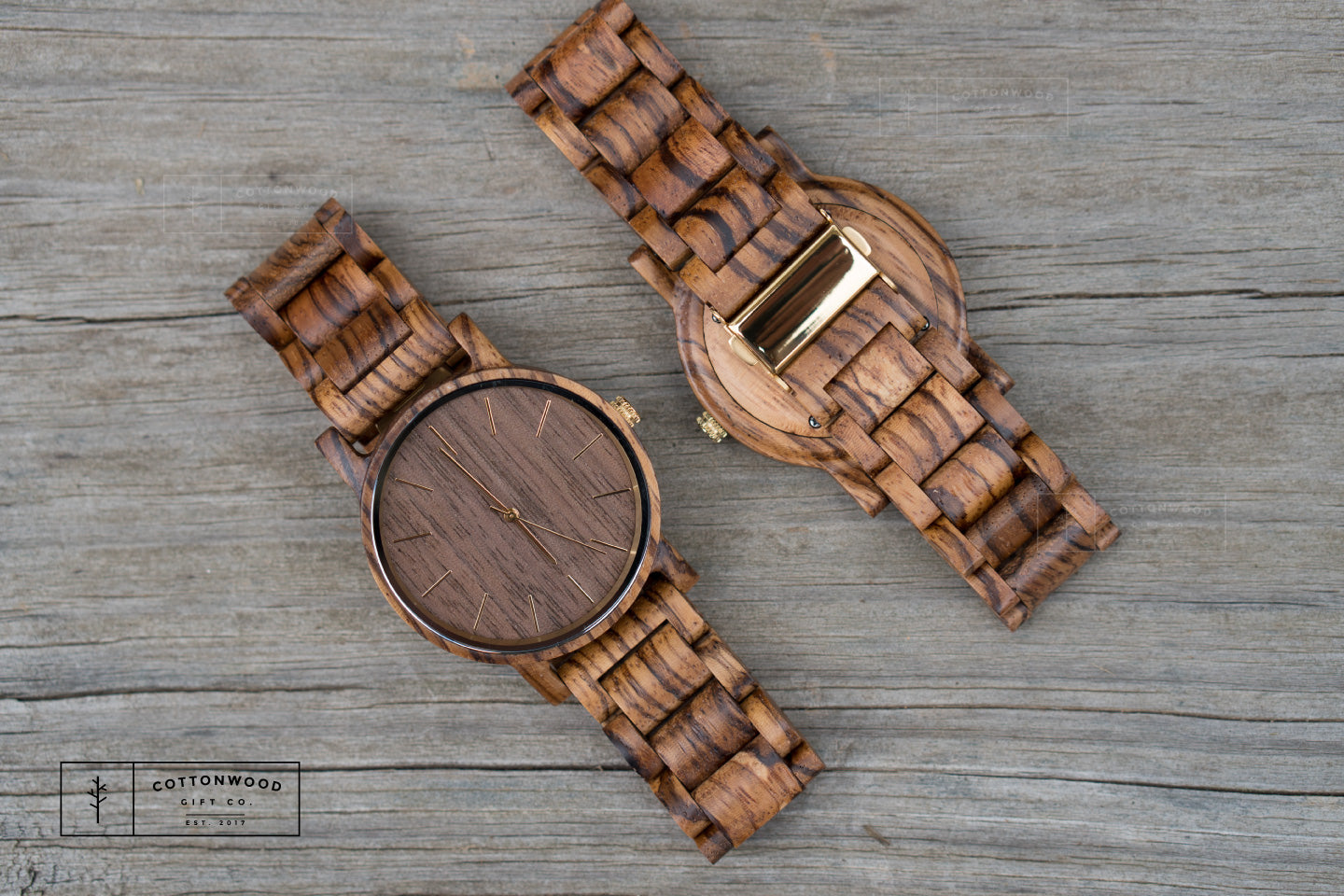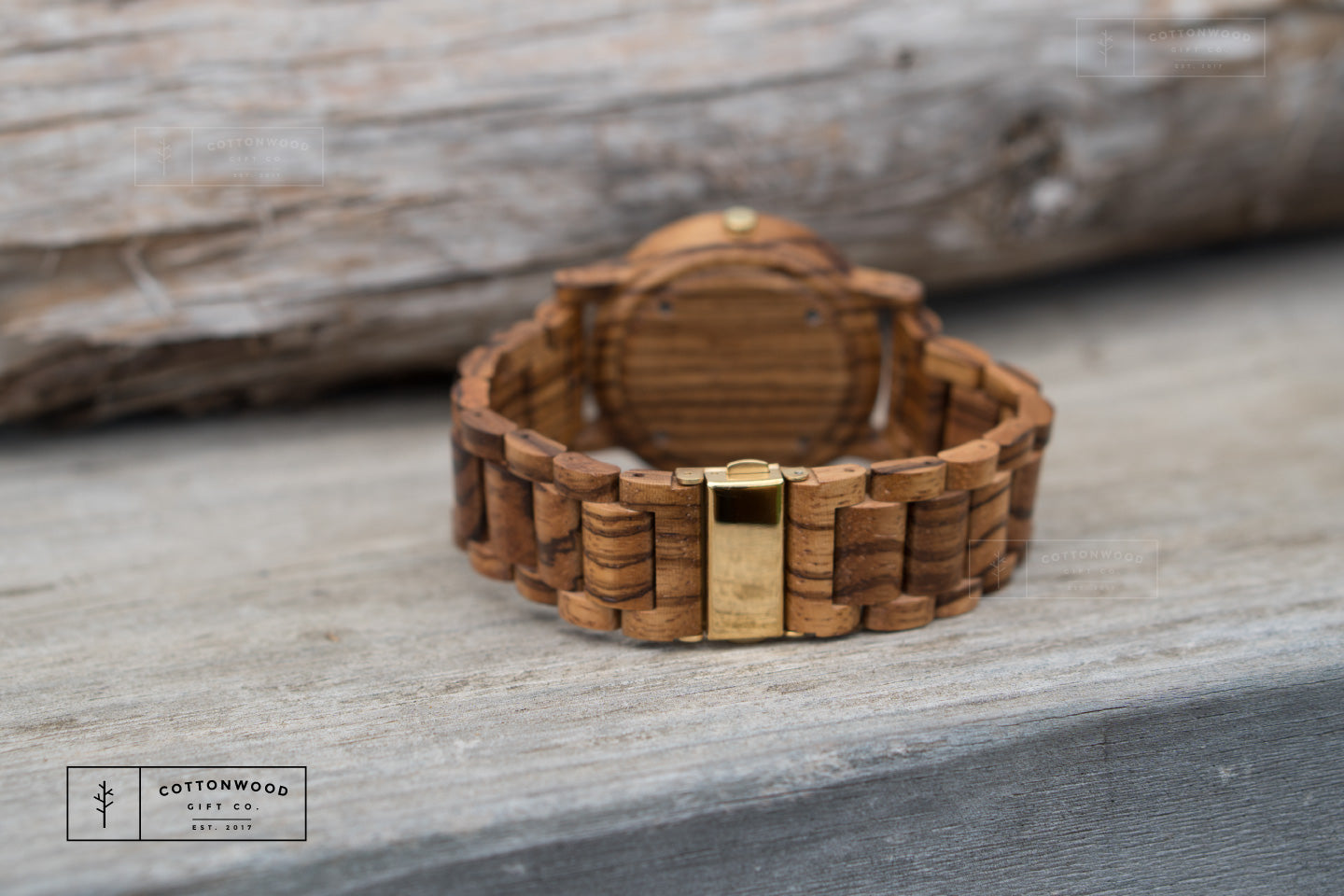 Wood watch made from natural zebra wood and has an all wood band that can be adjusted by removing wooden links. Features gold hour markers, hands, movements and clasp.